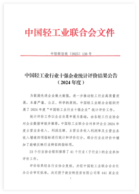 2025年7月9日,中國(guó)輕工業(yè)聯(lián)合會(huì)發(fā)布《中國(guó)輕工業(yè)行業(yè)十強(qiáng)企業(yè)統(tǒng)計(jì)評(píng)價(jià)結(jié)果公告》(中輕聯(lián)信統(tǒng)(2025)136號(hào)),發(fā)布了我國(guó)輕工業(yè)各行業(yè)的“2024年度中國(guó)輕工業(yè)行業(yè)十強(qiáng)企業(yè)”名單。